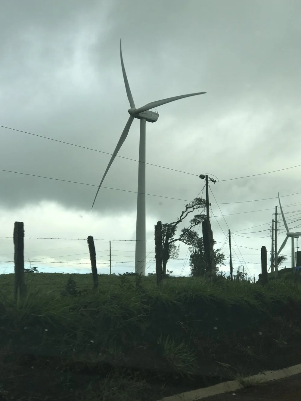 We realized that we made a complete circle for nothing, the road leading to The hanging bridges was the same way to Liberia. So we wasted an hour. The roads were so winding that we all got motion sickness. I can usually hold it together pretty well if I'm in the front seat but the roads killed me this trip. We had to even pull over for Cali a couple of times. We had to eventually find some food to get in the kids stomach. The only thing open on a Sunday evening was a Pollolandia (Chicken Land). The kids liked it. We loaded everybody up on Dramamine and headed off to finish our trip. We got to some roads that were not paved, just dirt roads. We saw a few wind mills that generate power for Costa Rica. They were pretty impressive on size.