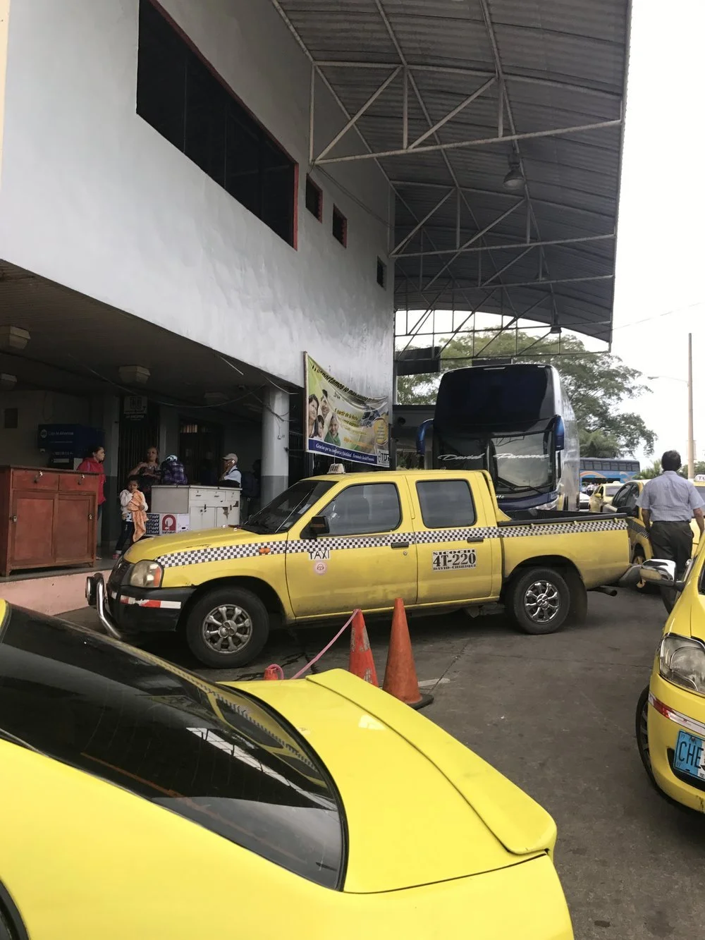 We arrived in David, Panama and took a taxi to get a rental car. The bus stop was crowded with people.