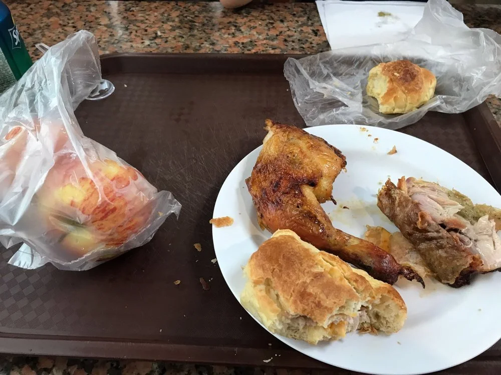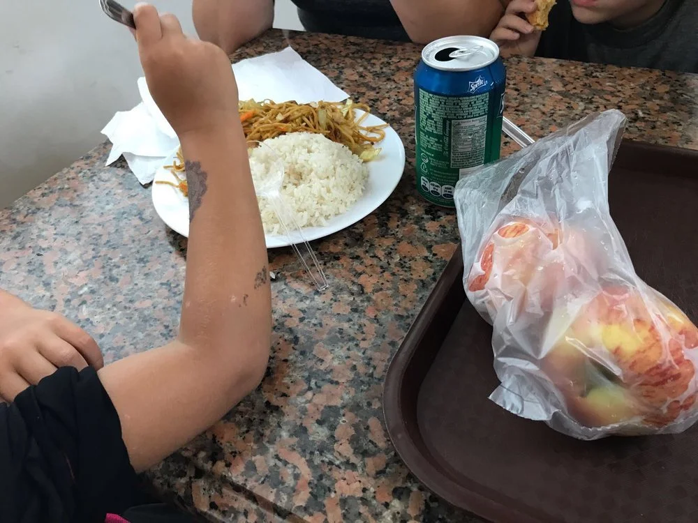 The bus stop for a 30 minute lunch. It was cafeteria style food, the kids had rice, chicken leg, chow mein, croissant, and apples. They were so hungry that they didn't even complain.