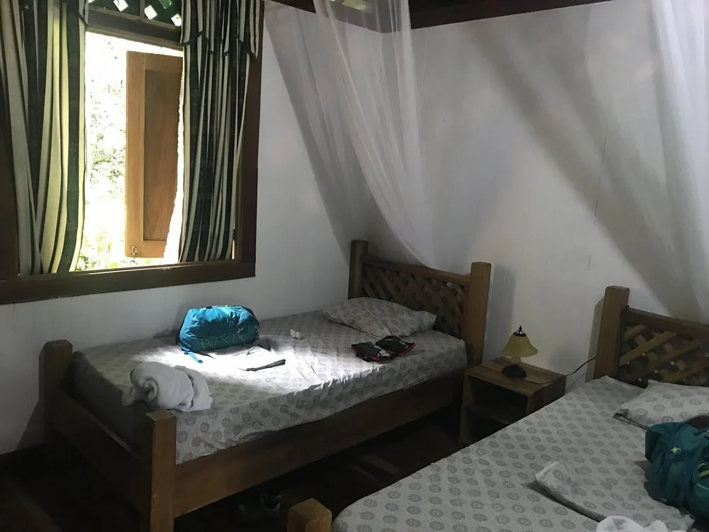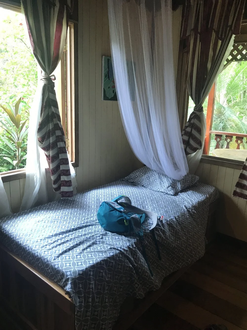We called a taxi and went to Cahuita. We arrived at Tito's Cabinas. We loved our little cabin. Our first night using mosquito nets.